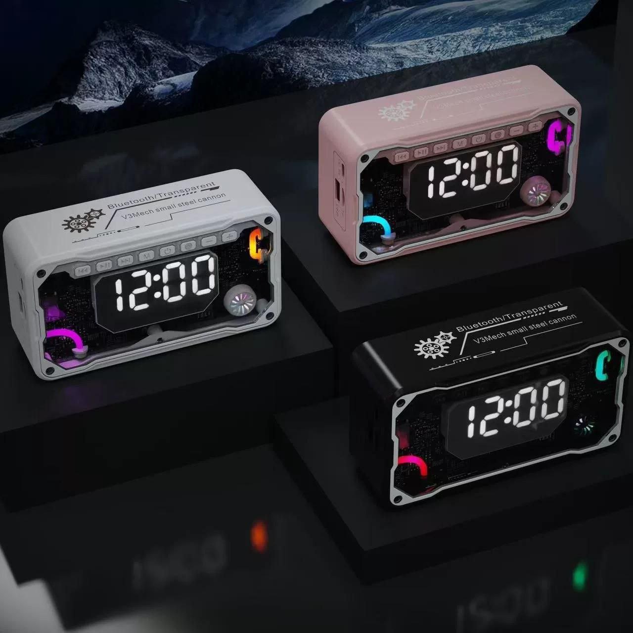 Mini parlante con diseño tipo “mech”, funciona como reloj y alarma, con batería de 500mAh y sonido potente. Ideal para casa, oficina o auto.(Blanco y negro )💥✨