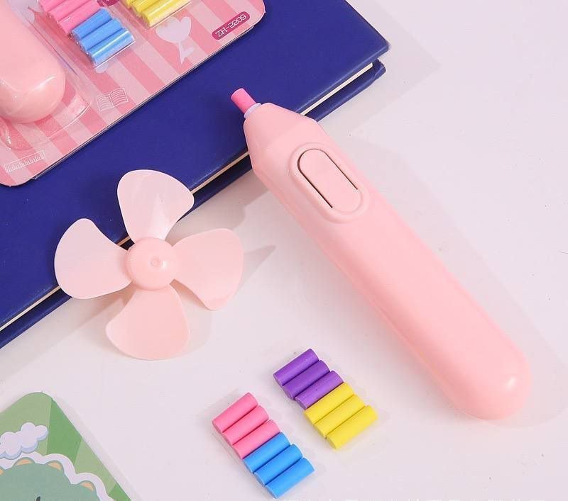 Borrador eléctrico 2 en 1 borrador✍🏻 / ventilador 🌬️ incluye repuestos ( funciona a pilas ) :✏️🌀✨